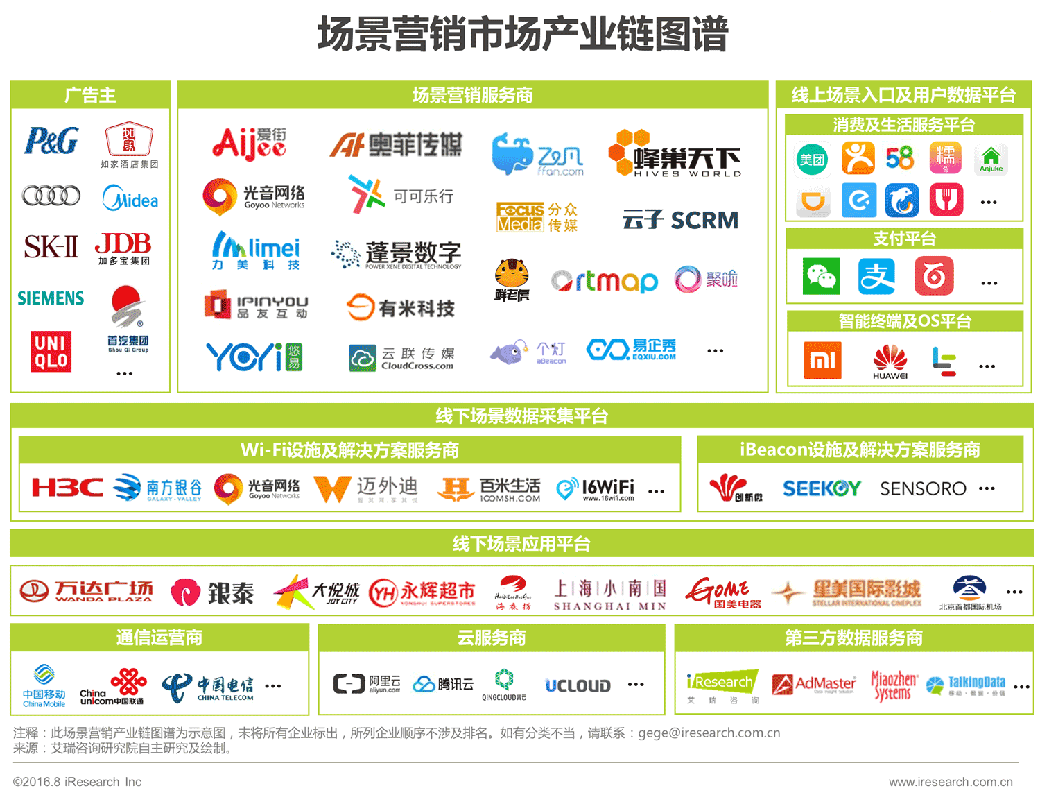 根据场景营销的发展状况,可将产业链主要参与者角色分为:线下场景入口、线上场景入口、场景及用户数据平台和场景营销服务商。1)线下场景入口主要包括:线下场景应用平台和线下场景数据采集平台;2)线上场景入口则包括:智能OS入口、支付平台入口、消费及生活服务平台入口、其它媒体入口;3)场景及用户数据平台包括:场景数据平台、金融数据平台、用户行为数据平台及其他数据平台。