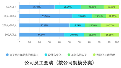 从薪资来看,50人以下的小公司工资最低,加薪比例也最低;而50人-200人的中型公司舍得高薪招人,也舍得给老员工加薪。