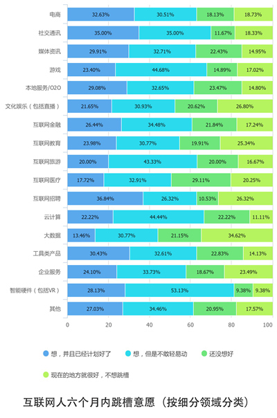互联网人员流动快,一年一跳几乎成为常态。在调查中,超过六成的互联网人有在近六个月中跳槽的打算。只不过,其中一大半处于“想跳槽,而又不敢轻举妄动”的状态,只有27%的互联网人已经为跳槽大计做好了准备,并打算付诸实施。