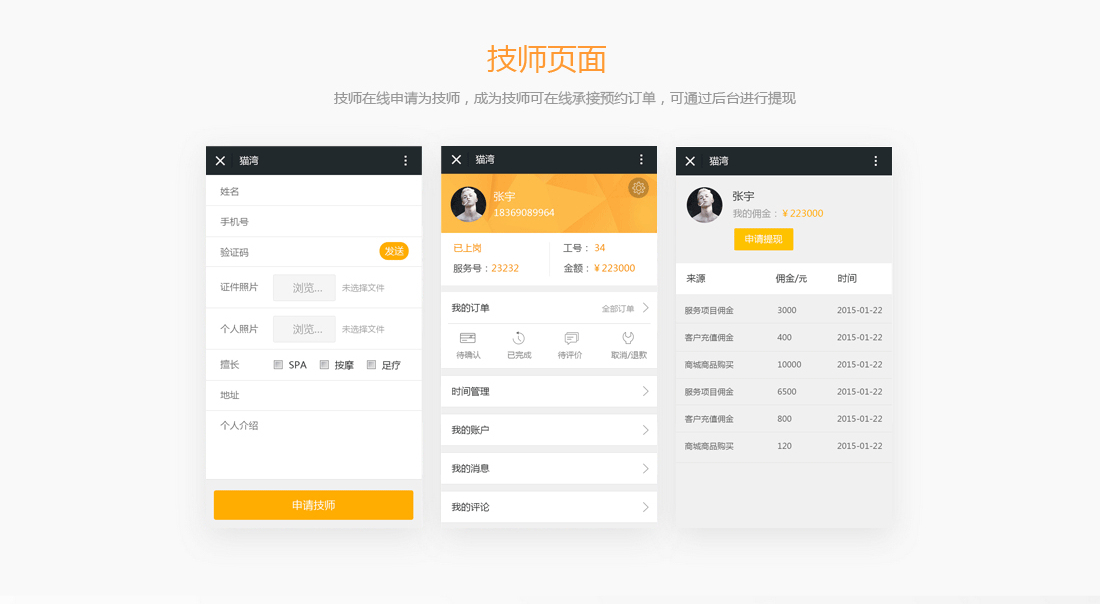 介绍:猫湾按摩商城,用户可通过微信关注猫湾,在线预约技师上门服务,可在线购买商品。