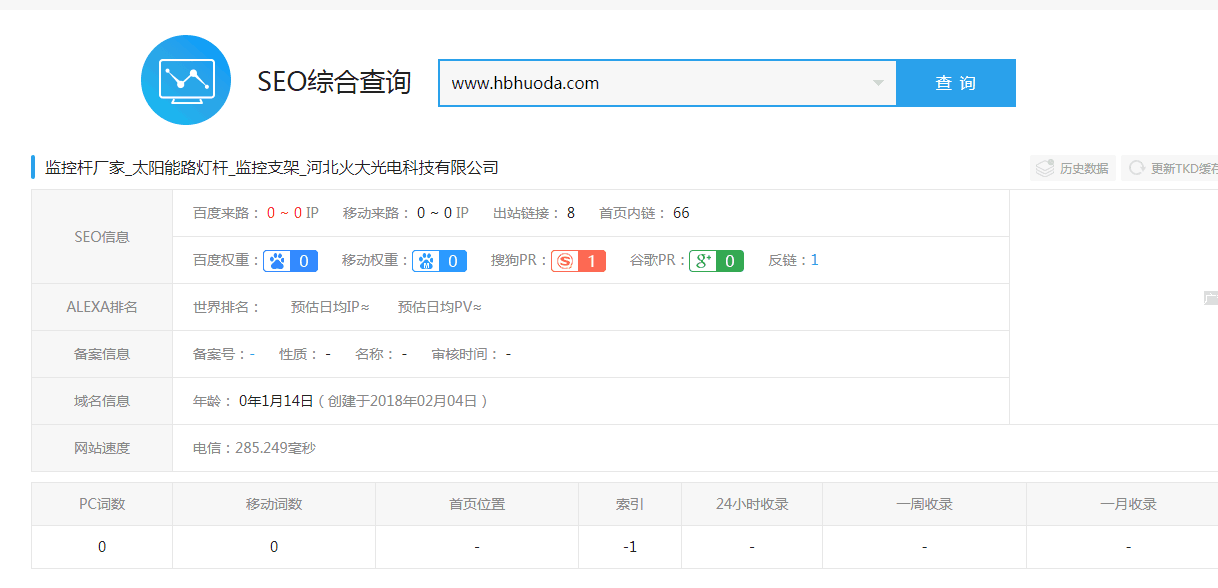 SEO优化人士将网站利用site:www.hbhuoda.com的形式查看了网站的内容的收录情况,起初网站只收录了网站的首页,内页都没有进行收录。我们技术人员利用sitemap、百度推送以及站长统计的代码放入网站中,使之网站内页能够让百度蜘蛛抓取全部页面以便持续收录提高排名。