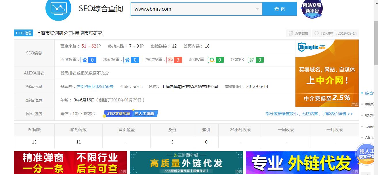 描述:易博市场研究是一家专业提供全方位市场调研咨询的公司,主要有消费者洞察研究、满意度研究、神秘顾客研究等服务,为客户提供保障业务增长的全方位专业的市场研究和咨询服务。